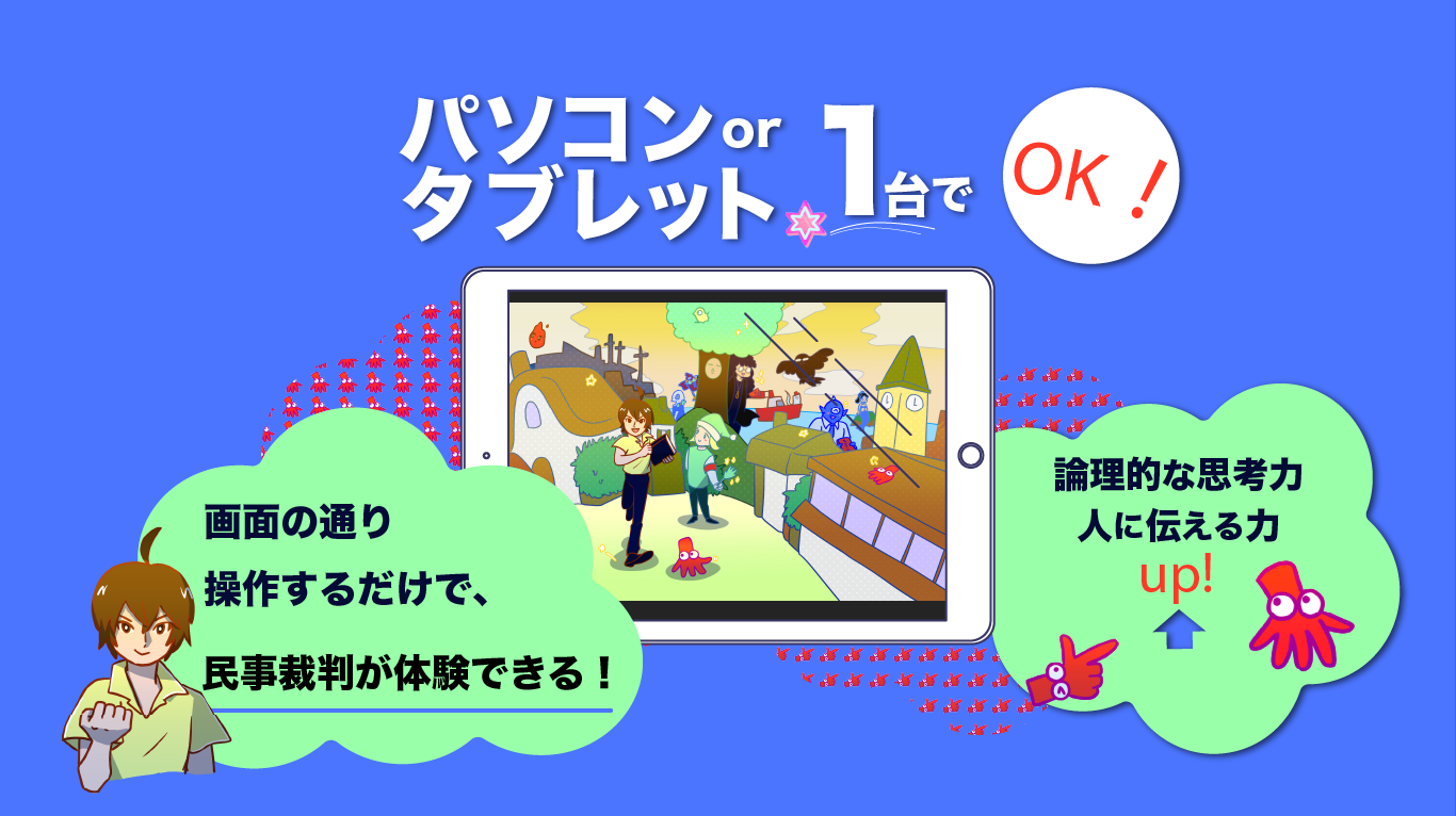 eコンテンツ教材『KIDSの民事裁判所!』は、 タブレットやノートパソコン1台で、誰でも手軽に民事裁判を体験することができます。