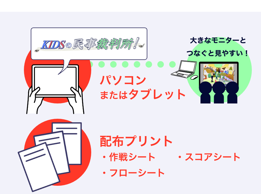 - パソコンまたはタブレット教材「KIDSの民事裁判所!」をダウンロードしたパソコンまたはタブレット1台(※動作環境については、ダウンロードページをご覧ください。)