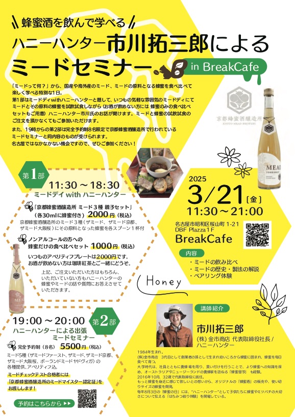 また、19時からの第2部は完全予約制8名限定で京都蜂蜜酒醸造所で行われている ミードセミナーと同内容のものが受けられます。名古屋ではなかなかない機会で すので、ぜひご参加ください!